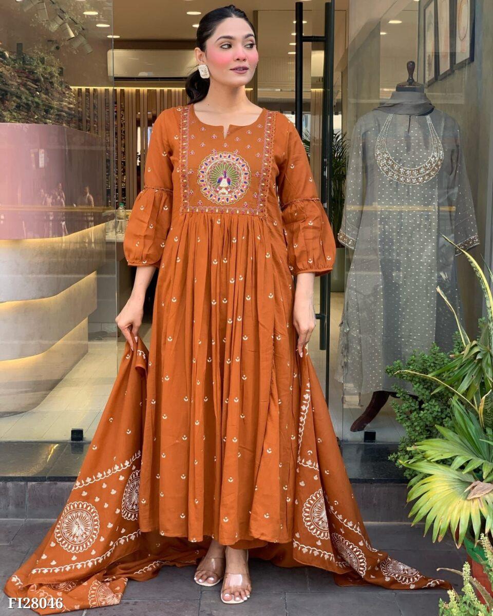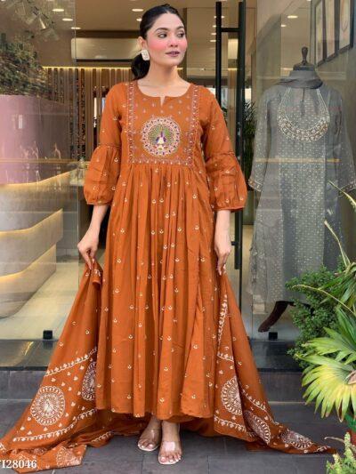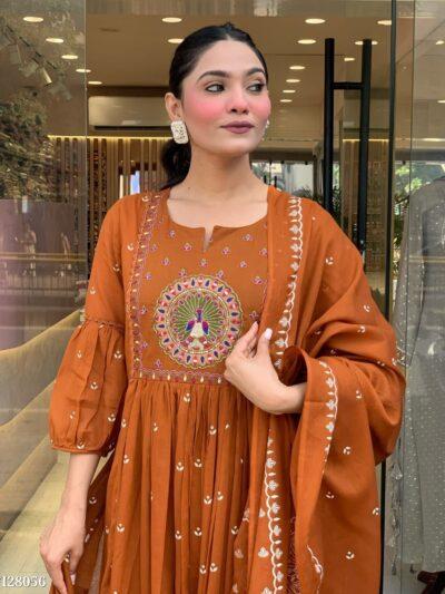Apne daily aur festive look ko brighten karein is vibrant Orange Mal Cotton Suit ke saath. Is set mein ek stylish flared kurti hai jiske yoke par khubsurat Peacock (Mor) design ki embroidery ki gayi hai. Soft Mal Cotton fabric ise garmiyon ke liye best aur breathable banata hai. Ye set matching pants aur dupatta ke saath aata hai jo aapko ek complete ethnic look deta hai.