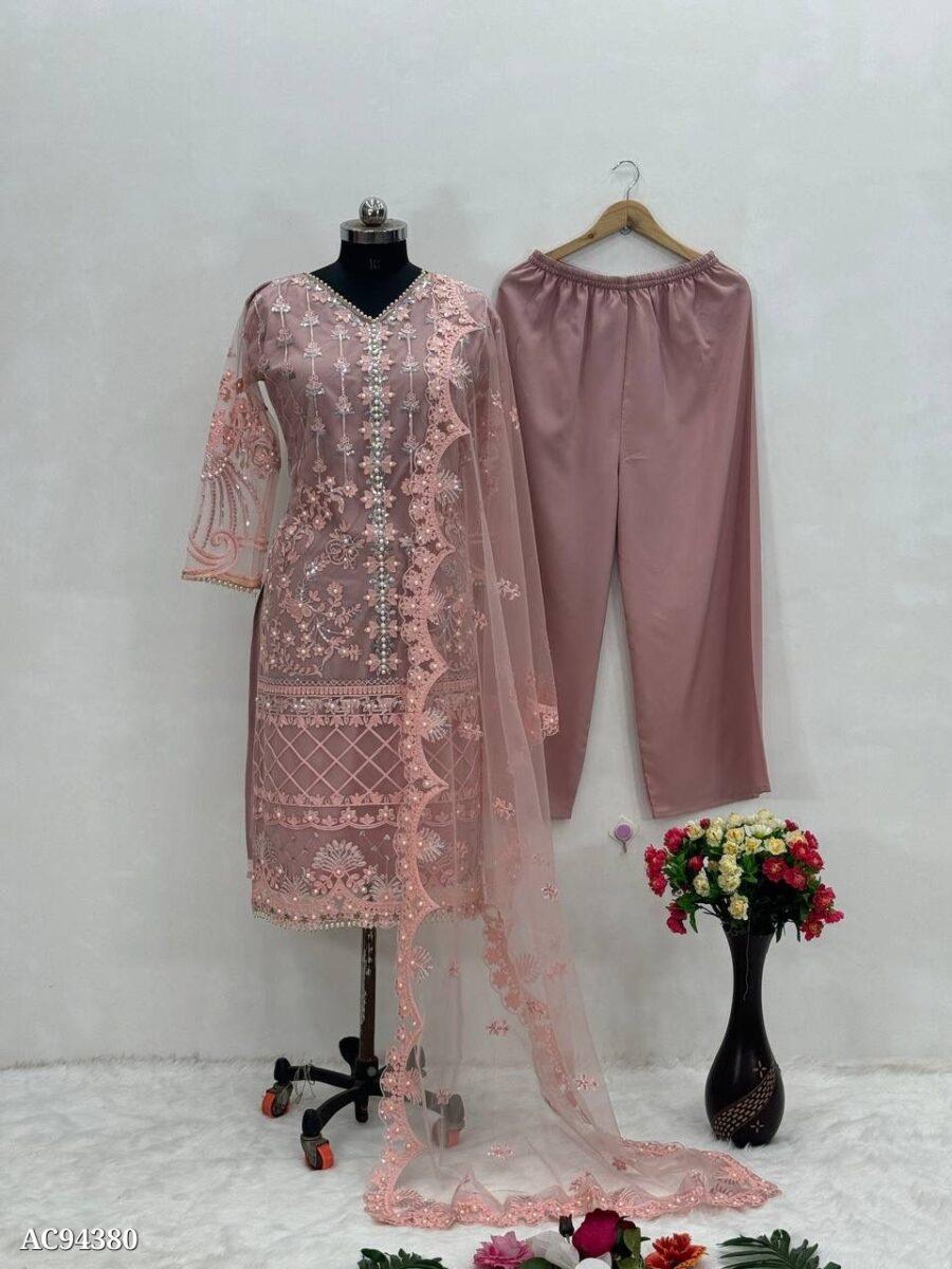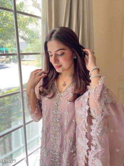 Work: Isme heavy chine sequence ke saath pearl handwork aur fancy lace di gayi hai.