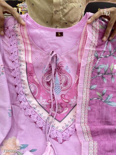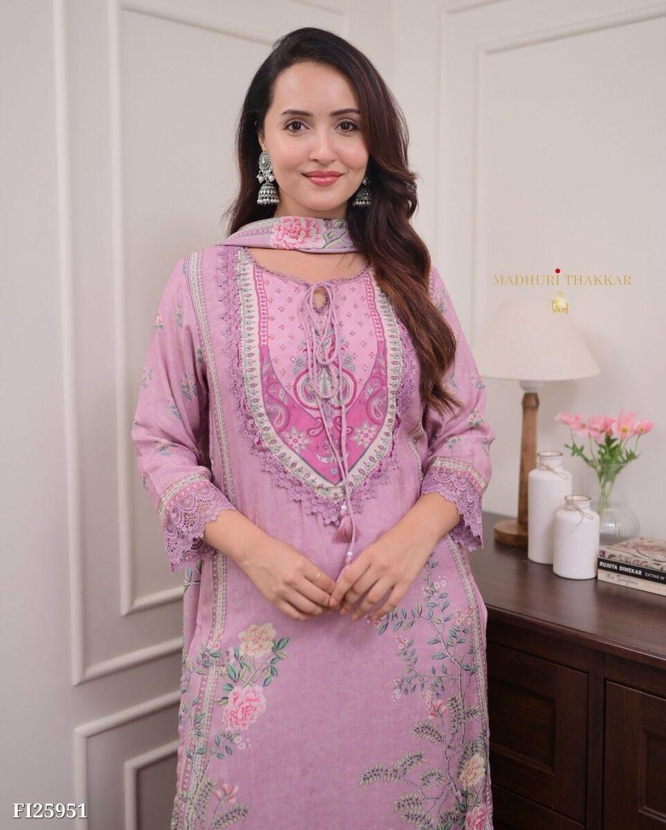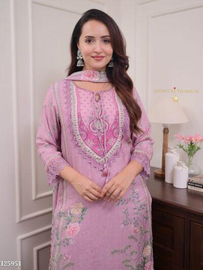 Upgrade your ethnic wardrobe with this stunning Lilac Pakistani Suit. Ye suit high-quality Muslin Silk fabric se bana hai, jo pehnne mein kaafi lightweight aur comfortable hai. Is par kiya gaya beautiful digital floral print aur intricate hand embroidery ise har festive occasion aur party ke liye perfect banata hai. Iska breezy fabric aapko din bhar fresh feel karwayega.