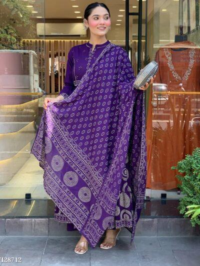 Suit par khubsurat Bandhani-style digital prints aur yoke par intricate detailing di gayi hai. Iske saath matching pants aur ek designer printed dupatta hai, jo aapko ek complete “Royal Look” deta hai.