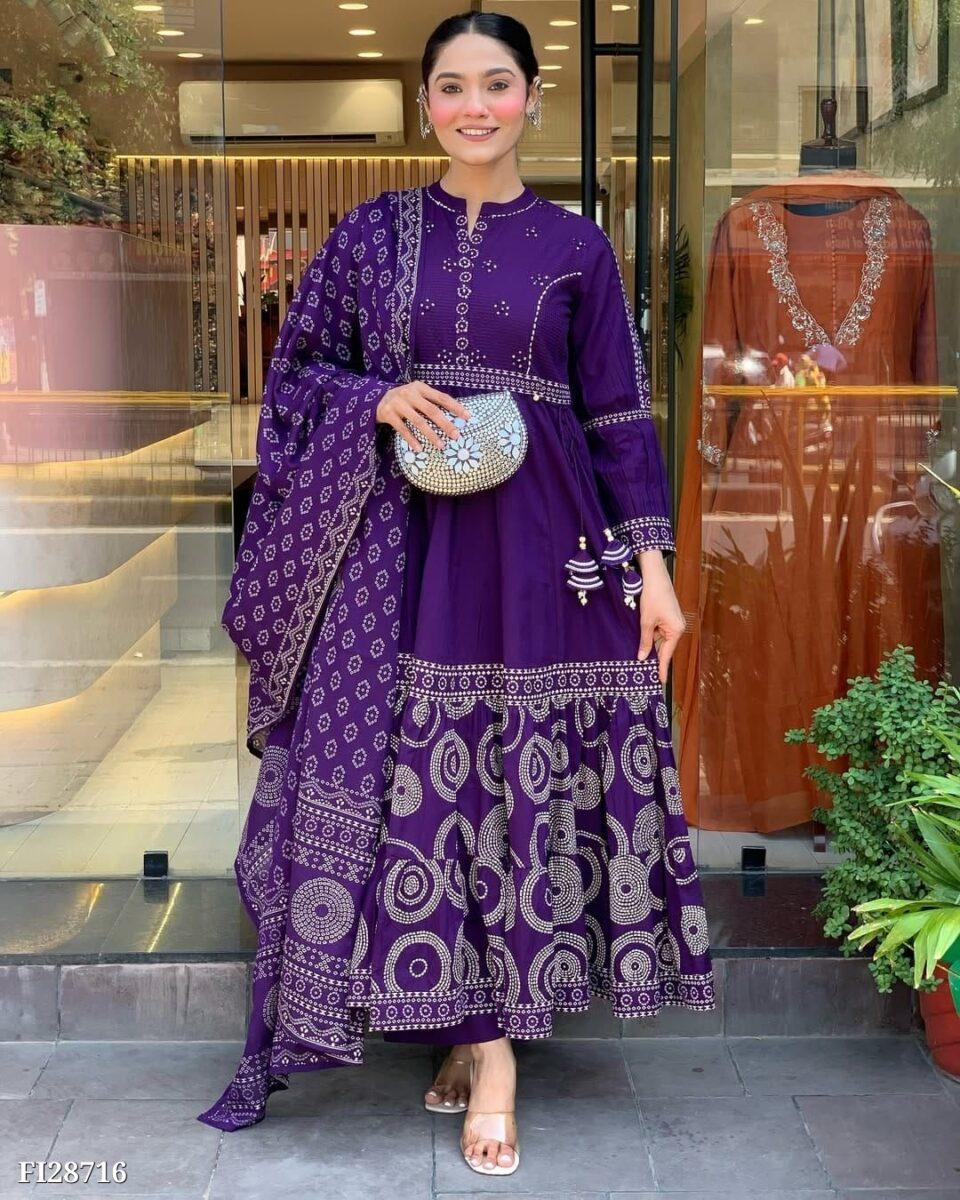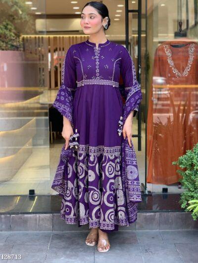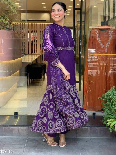 Is festival season mein apna jalwa bikherein hamare exclusive Purple Maslin Silk Anarkali Set ke saath. Ye suit “Padmavati Festival Collection” ka hissa hai, jo khas taur par bade gatherings aur family functions ke liye design kiya gaya hai. Iska Pure Maslin Silk fabric ise behad soft aur lightweight banata hai.