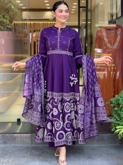 Premium Purple Maslin Silk Anarkali Suit with Bandhani Print & Designer Lace Work